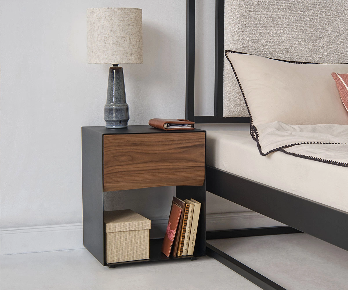 In der schlichten Schublade ohne Griff in schwarzer matter Pulverbeschichtung lassen sich private Gegenstände diskret verstauen. Die moderne Nachtkommode bietet mit der unteren Ablagefläche reichlich Platz für Bücher oder Zeitschriften, während die obere Fläche frei für Glas, Wecker oder Dekoration bleibt.Ästhetisches Highlight für Dein Schlafzimmer