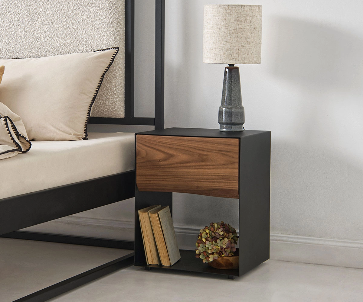 Außergewöhnlicher Nachttisch ARBOR aus Stahl in schwarzer matter Strukturfarbe und Eichenholz