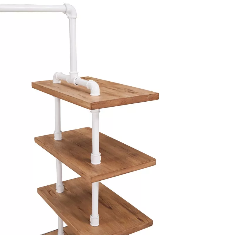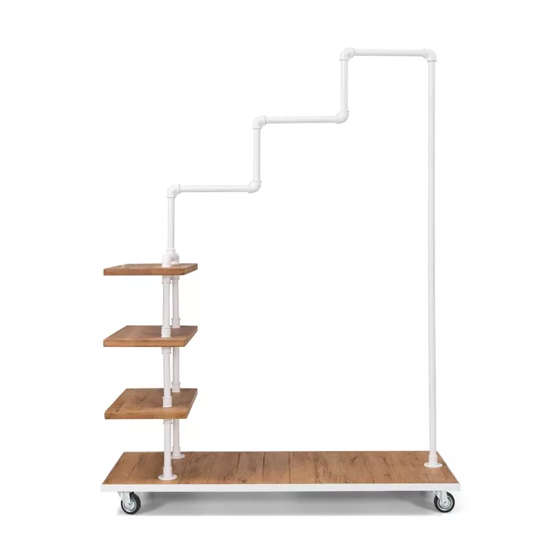 Dank der vier leichtgängigen Rollen ist der Kleiderständer besonders beweglich und flexibel einsetzbar – ideal für moderne Wohnräume oder skandinavisch eingerichtete Zimmer. Die Kombination aus weißen Metallrohren und hellem Holz fügt sich harmonisch in verschiedene Einrichtungsstile ein.