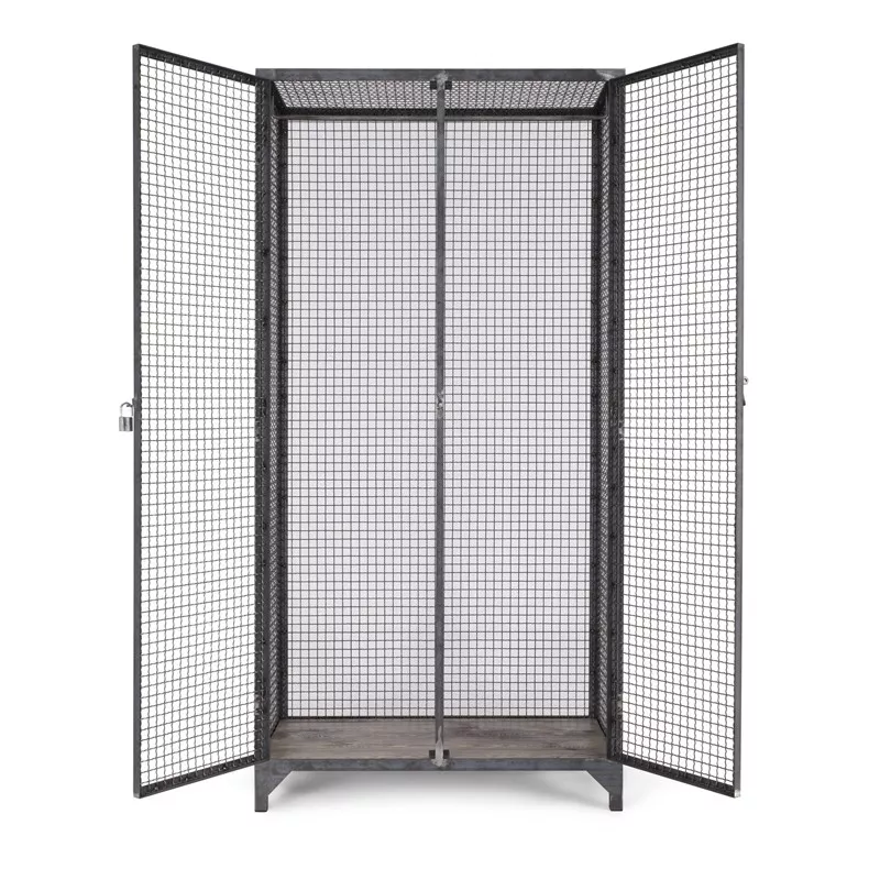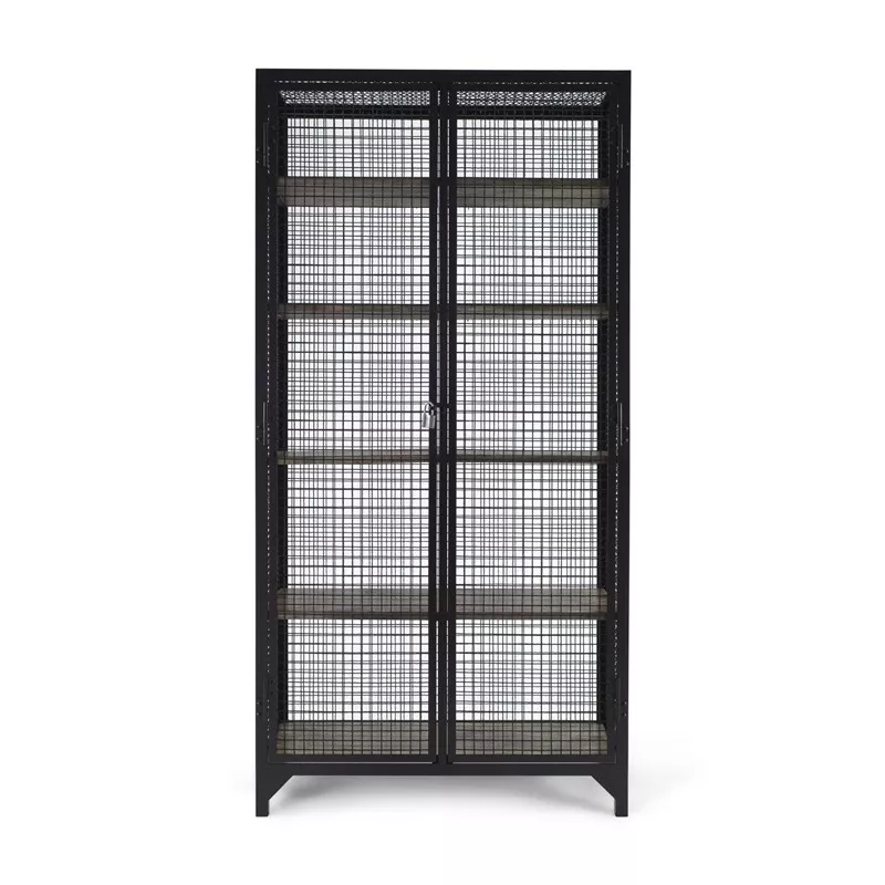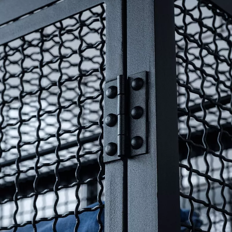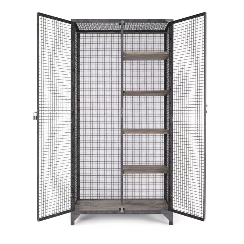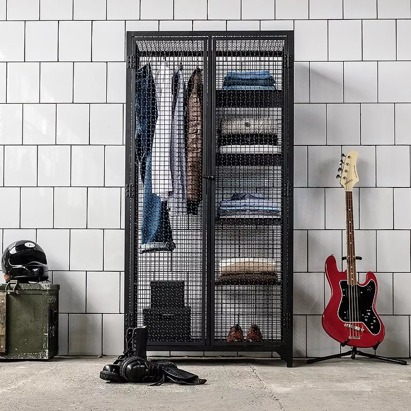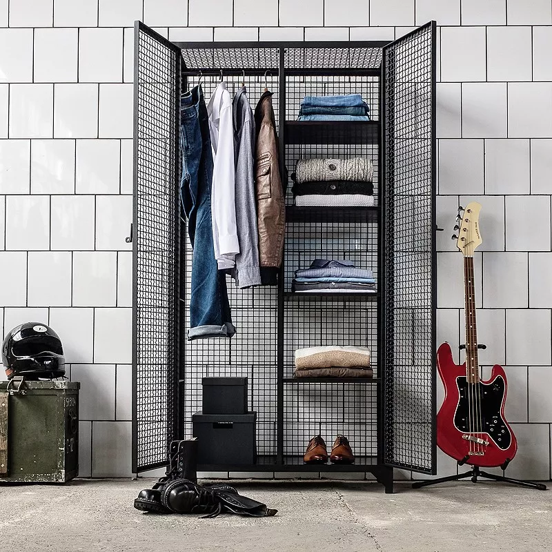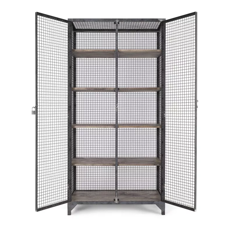 Der Korpus wird aus Stahlwinkeln und solidem Wellengitter in Handarbeit gefertigt. Die Ablageböden aus massivem Kiefernholz sind herausnehmbar, dadurch kann der Multischrank sehr vielseitig eingesetzt werden. Dank der eingebauten Bügelstange kann es als Kleiderschrank genutzt werden. Der Verschlusshebel der Tür lässt sich mit einem Vorhängeschloss sichern.