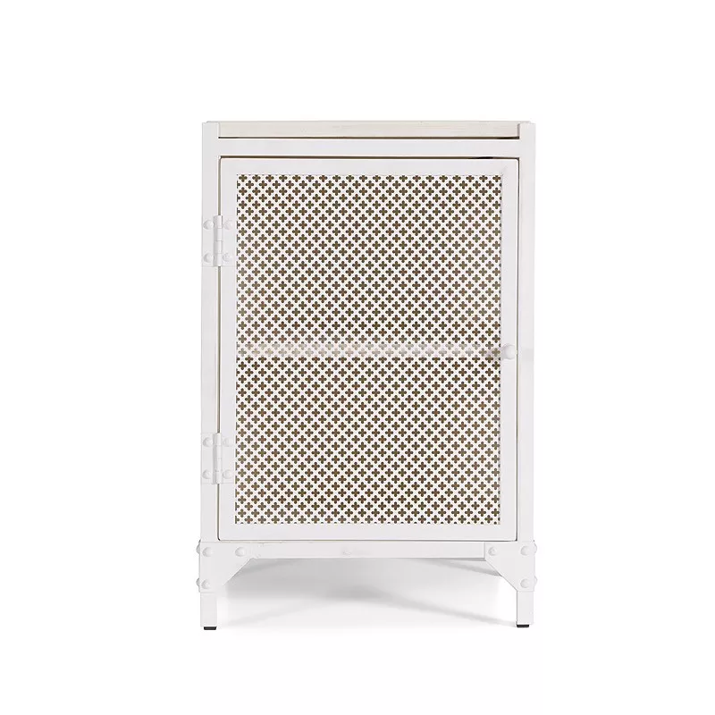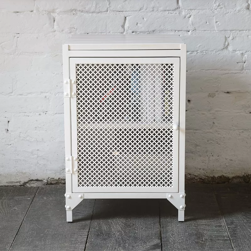 Der aus Stahl und Holz gefertigte Nachtschrank CLOVER versprüht einen ganz eigenen Fabrik Charme. Der weiß pulverbeschichtete Nachtschrank mit den kleinen Kleeblattmuster ist ein wahres Schmuckstück in jedem Schlafzimmer. Um die Struktur und die Maserung des Kiefernholzes nicht nur zu erhalten, sondern auch zu verschönern, wird Beize verwendet. Passend zum White Industrial Stil.