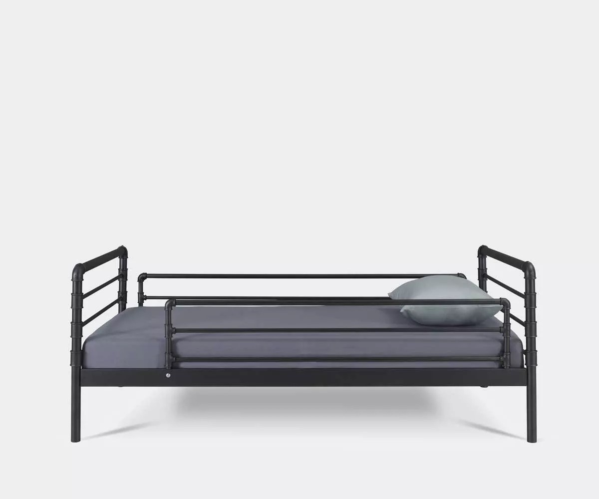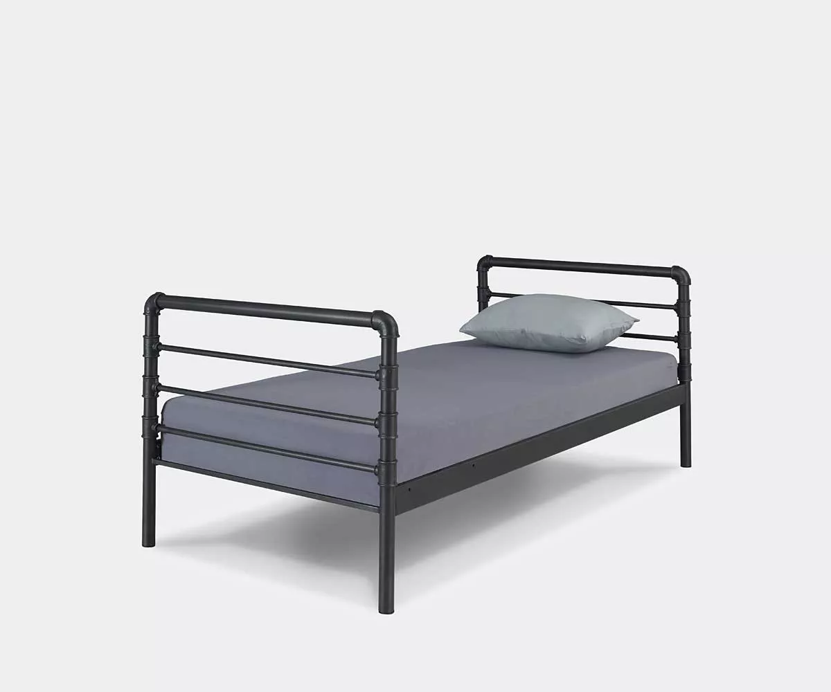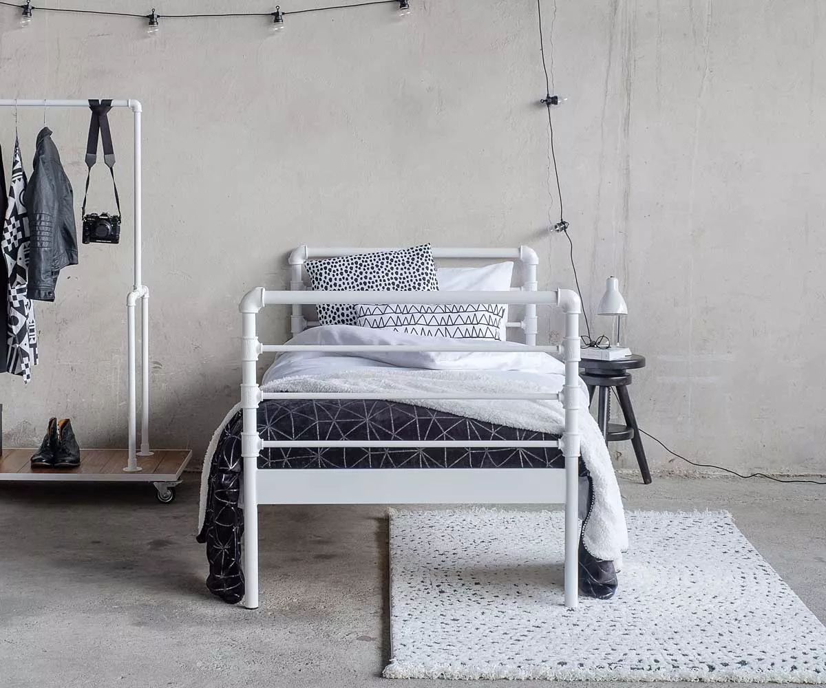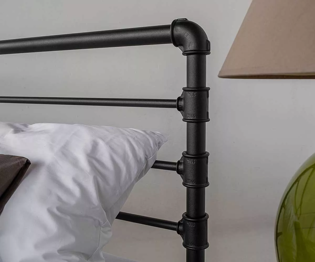 in untypisches Metallbett, der sowohl in ein cooles Jugendzimmer als auch in eine kleine Hipster-Single-Wohnung passt. Der Rohrrahmen verleiht dem Bett eine hohe Standfestigkeit und Stabilität. Einfach unzerstörbar.