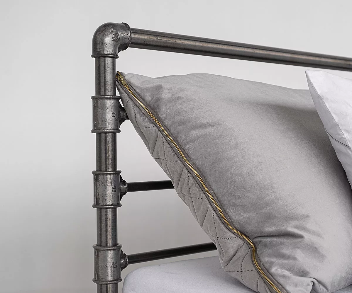 Das Metallbett NODUS 90x200 cm wird aus Wasserrohren und Rohrverbindern gebaut und sieht dadurch besonders cool aus. Es ist ein in aufwändiger Handarbeit hergestelltes Unikat für Liebhaber des Industrial-Stils, deswegen gibt es NODUS außer in Schwarz, Weiß und Graphit auch ohne Farbe, ganz roh, nur mit Klarlack geschützt. E
