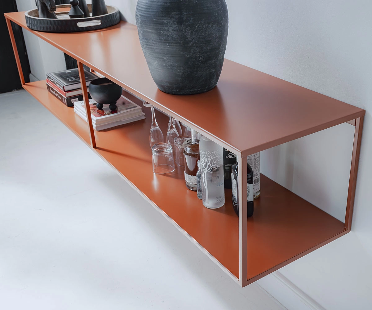 Entdecken Sie das PENDO TV Lowboard in der großzügigen Breite von 200 cm – das perfekte Möbelstück für modernes Wohnen, ideal für größere Wohnzimmer oder offene Raumkonzepte. Dieses hängende Lowboard wird vollständig aus hochwertigem, pulverbeschichtetem Metall gefertigt, was eine widerstandsfähige und langlebige Oberfläche garantiert. Die stabile Konstruktion bietet sicheren Platz für Ihre TV- und Hi-Fi-Geräte bei gleichzeitig luftigem Design.