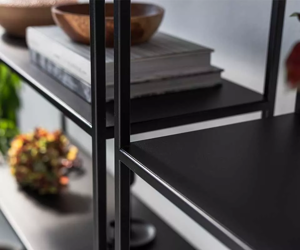 Das SIMPLEX Regal in elegantem Schwarz (RAL 9005) besticht durch sein zurückhaltendes, zeitloses Design und die strukturmatte Oberfläche, die dem Möbelstück eine edle Haptik verleiht. Diese dunkle Farbgebung macht das Regal zu einem vielseitigen Begleiter, der sich nahtlos in nahezu jedes Interieur einfügt – von modern-minimalistisch bis klassisch.