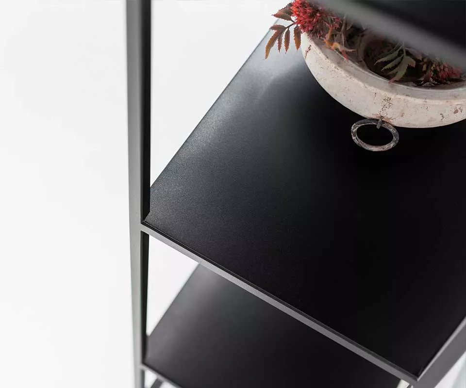 Das SIMPLEX Regal in strukturmattem Schwarz (RAL 9005) mit 50 cm Breite verbindet minimalistisches Design mit einer robusten, eleganten Oberfläche. Es ist die ideale Lösung für alle, die auf kleinem Raum Ordnung schaffen und dabei nicht auf Stil verzichten möchten.