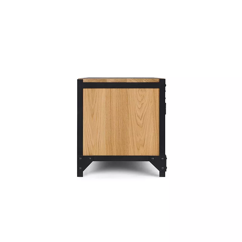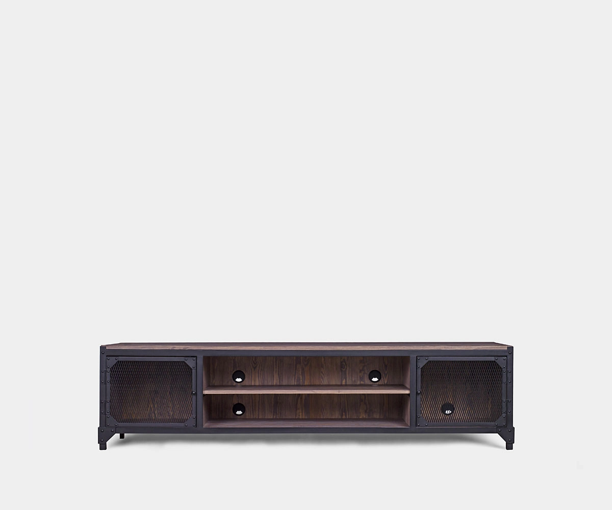 Das robuste TV Lowboard STATEN ISLAND M wird aus Stahl, Gitter und Kiefern- oder Eichenholz gefertigt. Das Lowboard ist 200 cm breit und bietet damit genügend Platz für alle TV-Geräte. Die Kabel können durch die auf der Rückseite des Boards befindlichen Öffnungen geführt werden. Bei der Kiefernholz-Variante werden die einzelnen Holzbretter hervorgehoben, die Variante mit Eichenholz wird dagegen ohne den Rillen zwischen den einzelnen Holzbretter gefertigt.