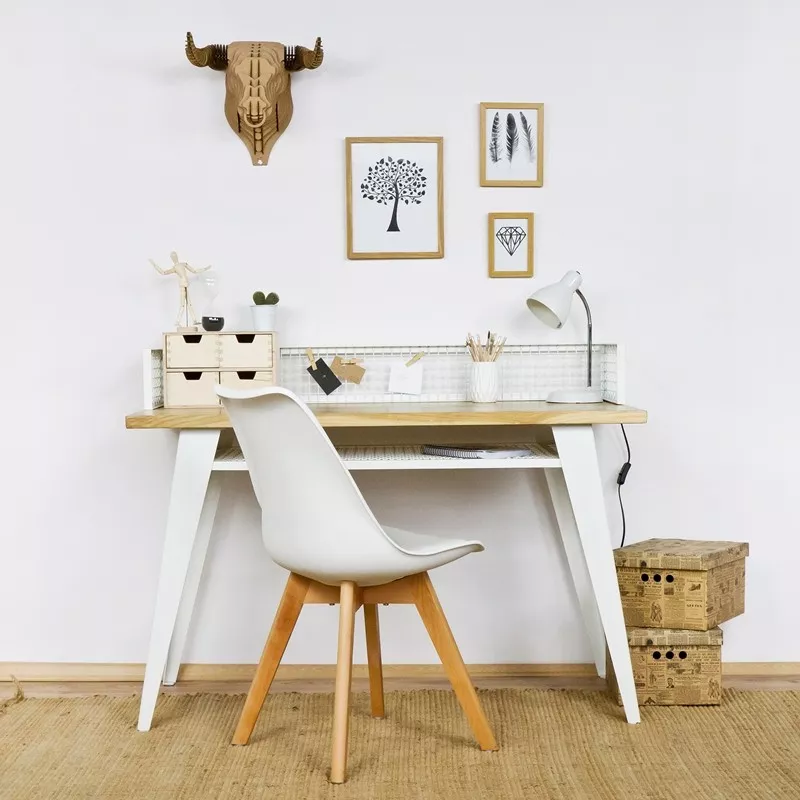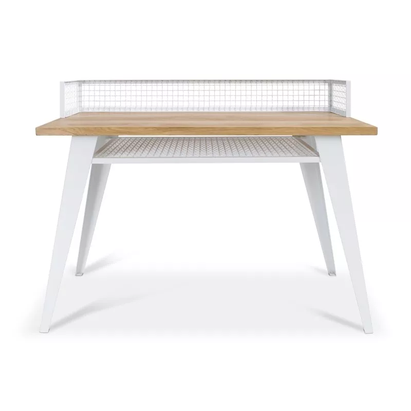 Unter der Arbeitsplatte befindet sich eine praktische Ablage aus schwarzem Wellengitter, die ausreichend Platz für Laptop, Tablet, Tastatur oder andere Arbeitsmaterialien bietet. Die zusätzliche Blende aus Wellengitter sorgt nicht nur für Sichtschutz, sondern verleiht dem Tisch auch von hinten ein stilvolles Erscheinungsbild – ideal für offene Wohnräume, Ateliers oder Homeoffices.